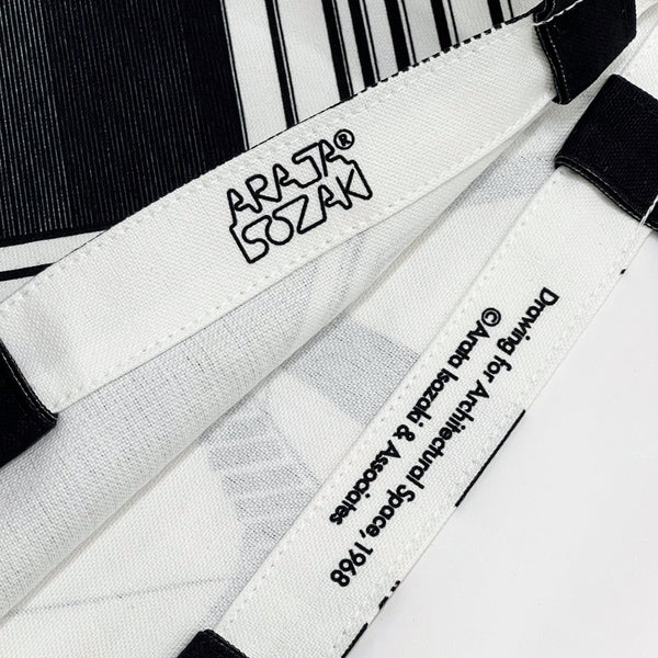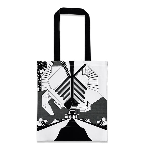 「建築空間」(福岡相互銀行大分支店の内部空間を表現したドローイング)のイメージを全面にプリントしたトートバッグ。60年代以降の美術の文脈で登場する用語CAMP, POP, OPをつなげた"CAMPOPOP"のロゴが入り、ポップな仕上がりになっています。服装に大胆な印象を与え、おしゃれな日常にぴったりのアイテムです。
